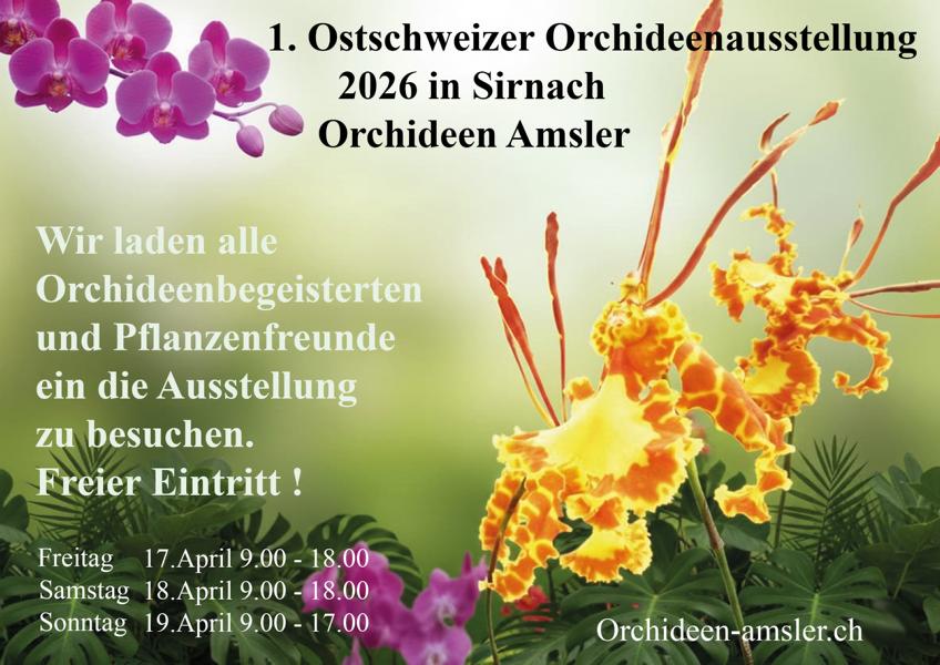 Vom 17.-19.04.2026 fand bei Roland Amsler in Sirnach die 1.Ostschweizer Orchideenausstellung statt. Orchideen aus aller Herren Länder; ein Verkauf Schweizer Gärtner wie Bruno Jenny und Roland Amsler; sowie von Equagenera aus Equador lockten zahlreiche Hobbybegeisterte an. Auch wir Ostschweizer Orchideenfreunde durften uns bei der Ausstellung präsentieren.
